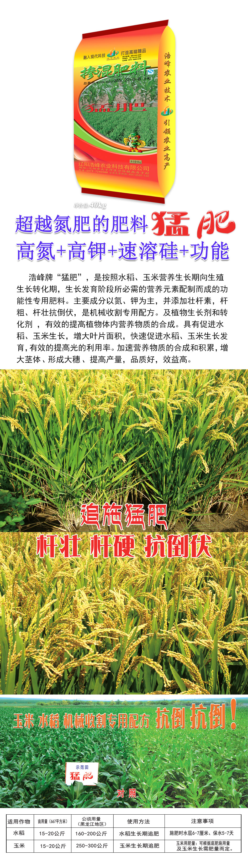 浩峰牌“猛肥”,是按照水稻、玉米營(yíng)養(yǎng)生長(zhǎng)期向生殖生長(zhǎng)轉(zhuǎn)化期,生長(zhǎng)發(fā)育階段所必需的營(yíng)養(yǎng)元素配制而成的功能性專用肥料。主要成分以氮、鉀為主,并添加壯桿素,桿粗、桿壯抗倒伏,是機(jī)械收割專用配方。及植物生長(zhǎng)劑和轉(zhuǎn)化劑 ,有效的提高植物體內(nèi)營(yíng)養(yǎng)物質(zhì)的合成。具有促進(jìn)水稻、玉米生長(zhǎng),增大葉片面積,快速促進(jìn)水稻、玉米生長(zhǎng)發(fā)育,有效的提高光的利用率。加速營(yíng)養(yǎng)物質(zhì)的合成和積累,增大莖體、形成大穗、提高產(chǎn)量,品質(zhì)好,效益高。