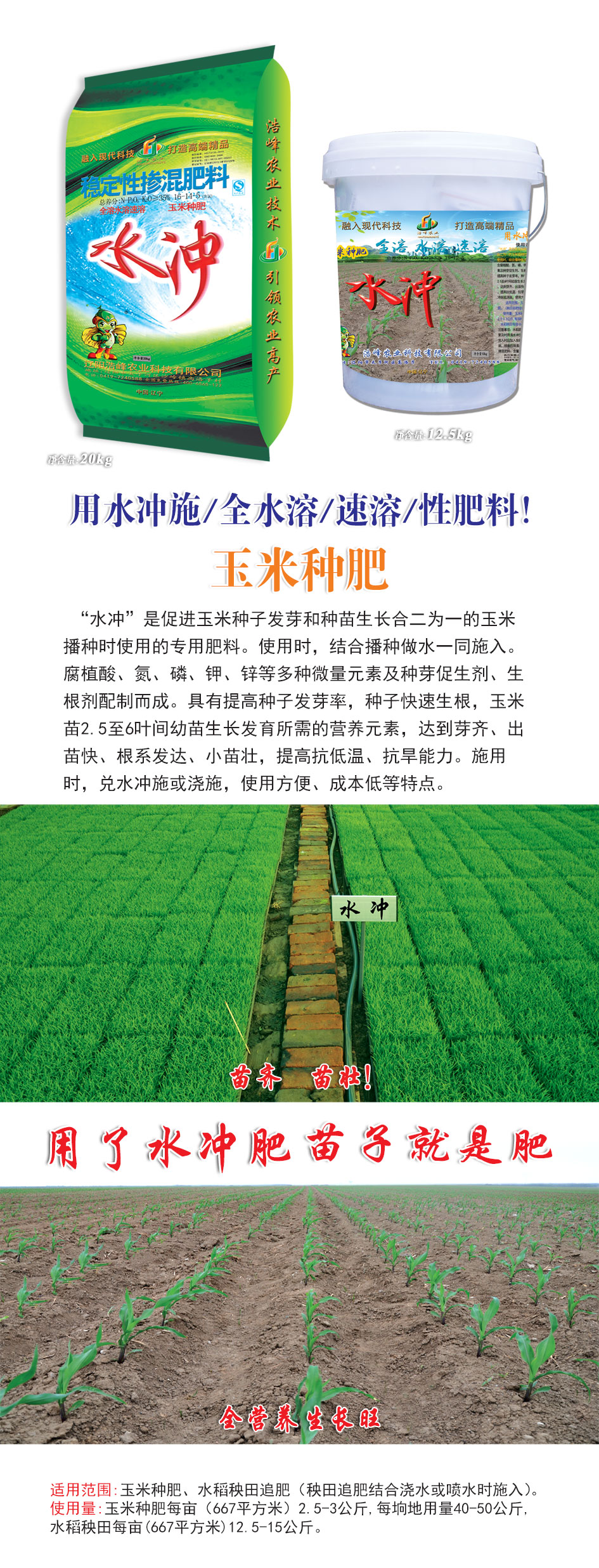 播種時使用的專用肥料。使用時,結(jié)合播種做水一同施入。腐植酸、氮、磷、鉀、鋅等多種微量元素及種芽促生劑、生根劑配制而成。具有提高種子發(fā)芽率,種子快速生根,玉米苗2.5至6葉間幼苗生長發(fā)育所需的營養(yǎng)元素,達到芽齊、出苗快、根系發(fā)達、小苗壯,提高抗低溫、抗旱辛?。施?